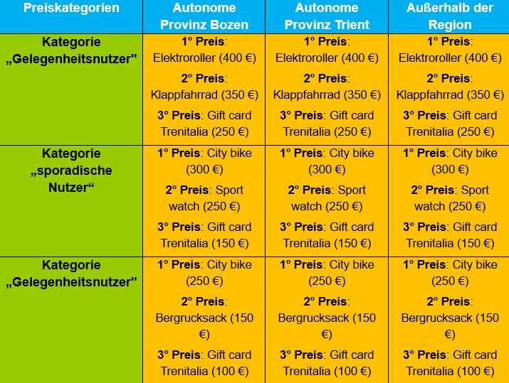 Jede Kategorie ist je nach Wohnort in drei Kategorien unterteilt: Autonome Provinz Bozen, Autonome Provinz Trient, außerhalb der Region. Ein Benutzer kann daher nur in eine der 9 insgesamt definierten Preisklassen fallen.