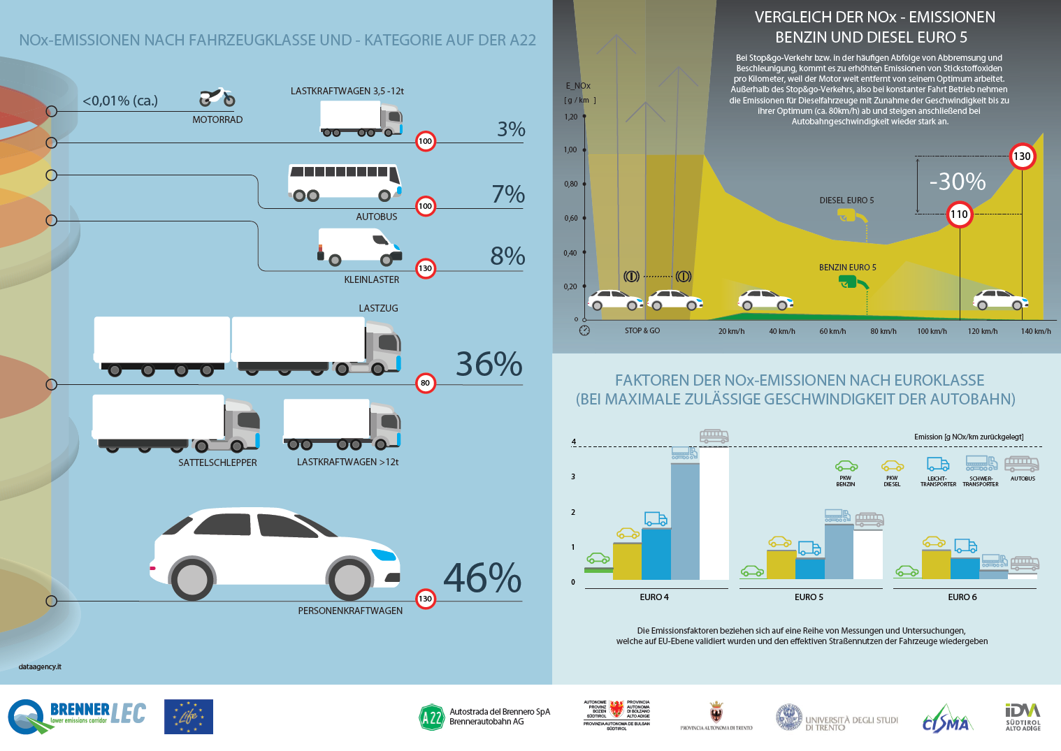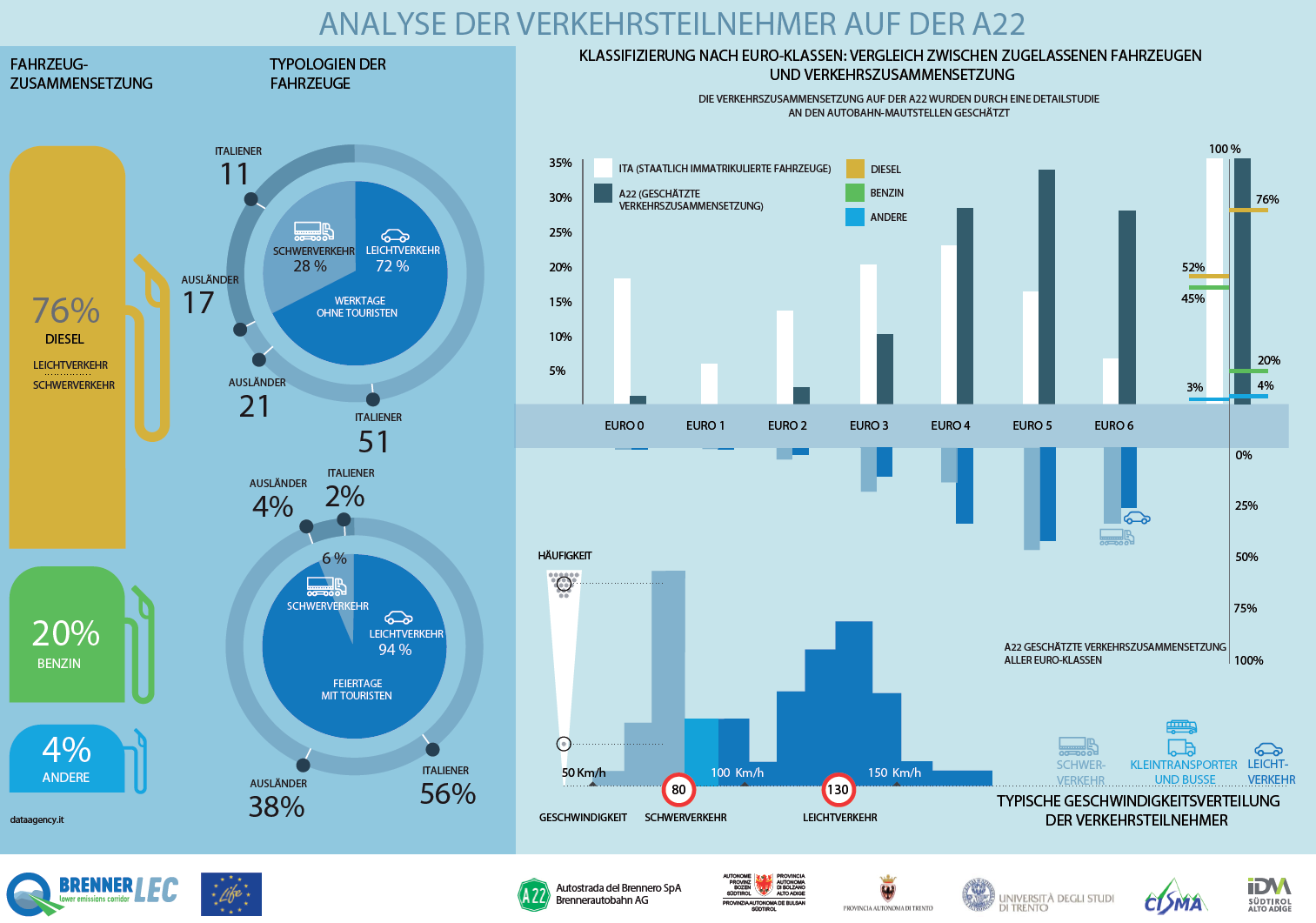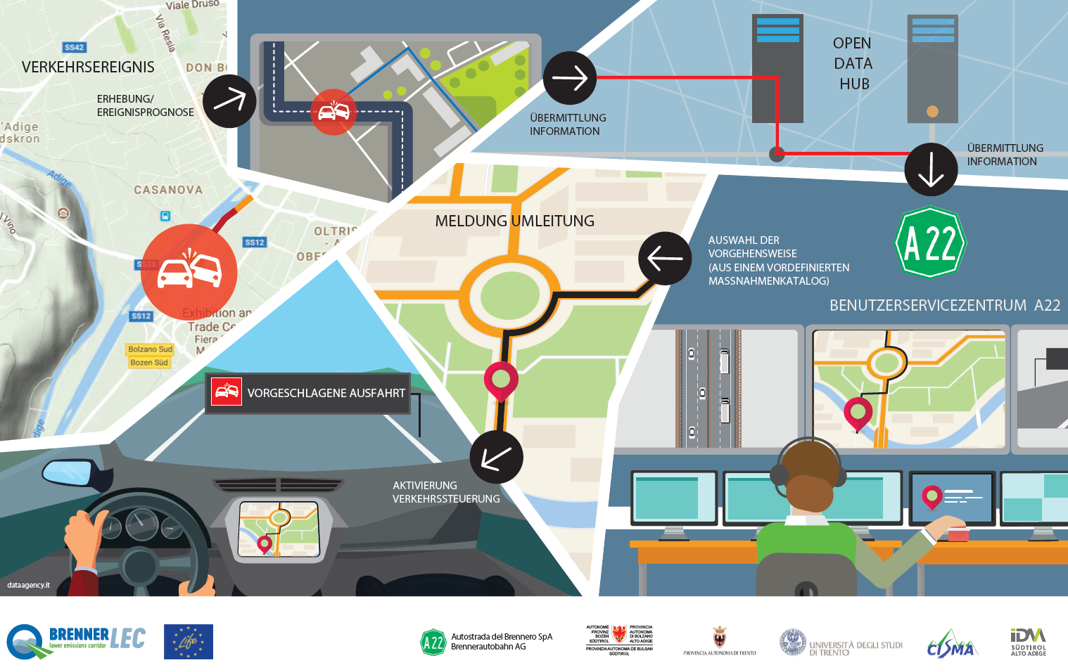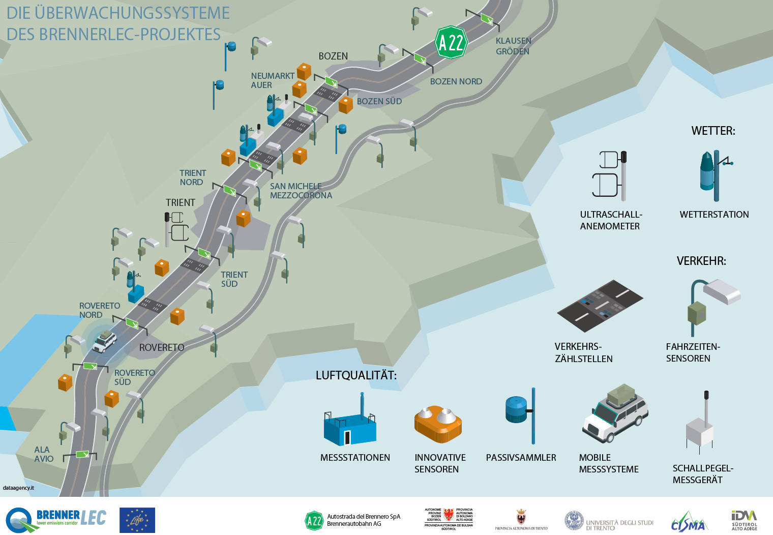 Die Infografik stellt in qualitativer Weise das durch das Projekt aktivierte Überwachungssystem dar. Die Interessenbereiche sind drei: das Wetter, der Verkehr und die Umwelt. Die Wetterbedingungen sind notwendig um genaue Vorhersagen für die Ausbreitung der Schadstoffe in der Atmosphäre zu machen, sie wurden mithilfe traditioneller Wetterstationen und einem Schallpegelmessgerät (welches in der Lage ist, die vom Verkehr produzierten Turbulenzen zu beurteilen) gemessen. Der Verkehr wird mit herkömmlichen Induktionsschleifen gemessen, welche durch neue Techniken integriert werden um die Fahrzeiten zu ermitteln. Die Fahrzeiten werden auf der Autobahn als auch auf außerstädtischen Straßen durch einen anonymen Scan von Telepass und Bluetooth-Geräten der Fahrzeuge gemessen. Die Umweltbedingungen (Luft- und Lärmqualität) werden mit herkömmlichen Instrumenten der Messstationen der Landesagenturen von Südtirol und dem Trentino gemessen, aber auch mit Instrumenten, welche auf nicht konventionelle Technologien basierenden. Das Monitoring der Luftqualität ist eines der wissenschaftlichsten Aspekte des Projektes, da es die Messung von noch nicht so bekannten Schadstoffen (Industrieruß) erlaubt, zudem lässt es auch eine vergleichende und intensive Beurteilung der innovativen und günstigeren Sensoren zu, welche in Zukunft für eine ausgedehntere Überwachung entlang der Fahrbahn genutzt werden könnten. Besonderes Interesse gilt auch der Verwendung von Passivsammlern welche es erlauben, die Fünfjahres-Durchschnittswerte der NO2 -Konzentrationen in verschiedenen Entfernungen zur Autobahn zu messen. Die Erweiterung dieser Systeme erfolgt durch die Integration mit Industrieruß-Messungen und Messungen der Partikelanzahl und hat die Aufgabe, die Emissionen des Verkehrs zu charakterisieren. Schließlich werden die räumlich erfassten Daten durch ein mobiles Messsystem gemessen und die Luftschadstoffausbreitungsmodelle damit kalibriert.