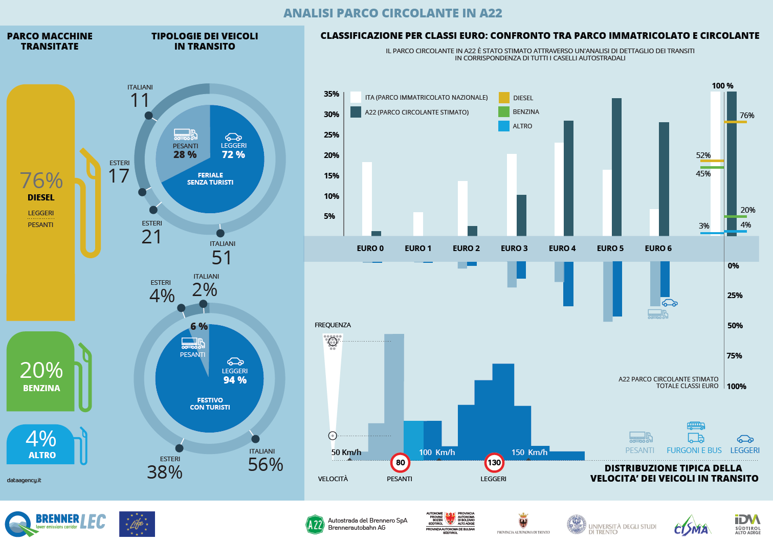 Grazie agli studi condotti all’interno del progetto BrennerLEC si è riusciti ad ottenere un quadro di riferimento molto preciso dei veicoli circolati nel 2017 sull’A22 nel tratto compreso tra Brennero e Affi. Numero, tipologia, origine e destinazione, nazionalità, caratteristiche emissive, velocità medie, consumi medi, alimentazione: grazie a tutte queste informazioni sarà possibile ora perfezionare le misure sperimentali di BrennerLEC.