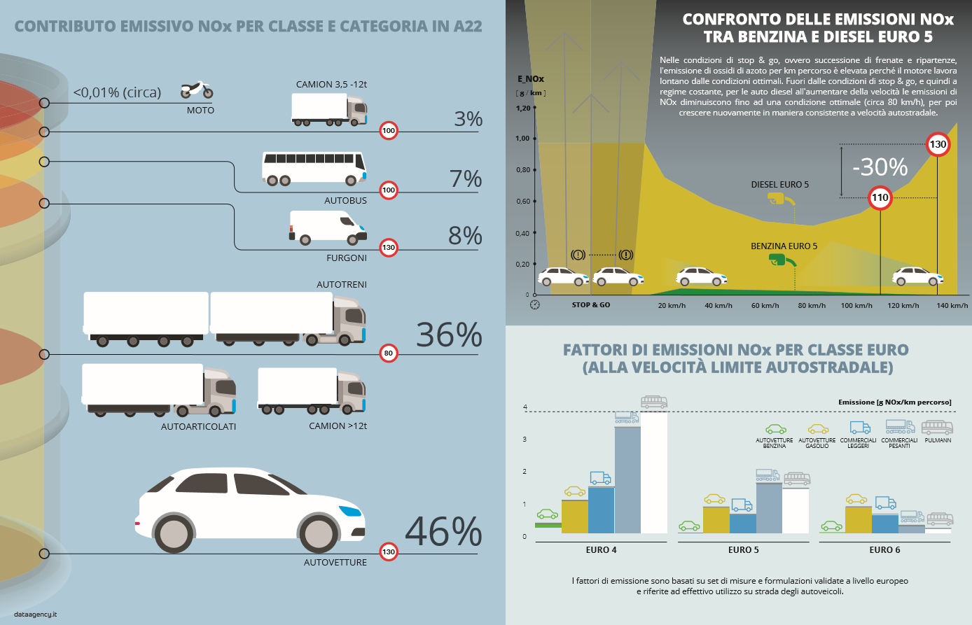 La gestione dinamica della velocità è quindi un’azione importante in quanto le emissioni di NOx delle autovetture diesel (anche le più recenti) aumentano in modo rilevante al di sopra degli 80 km/h. Per esempio, passando da una velocità di 100 km/h ad una di 130 km/h un’autovettura diesel Euro 5 aumenta l’emissione di NOx di circa il 30%. La riduzione della velocità di transito incide inoltre anche sul valore delle concentrazioni medie annue di NO2 a bordo autostrada. Il progetto BrennerLEC ha misurato una riduzione di circa il 10% a fronte di una diminuzione media della velocità delle autovetture di 15 km/h a seguito della riduzione del limite di velocità a 100 km/h. I dati emersi da questo studio consentono di meglio comprendere i primi significativi effetti della riduzione dinamica della velocità.