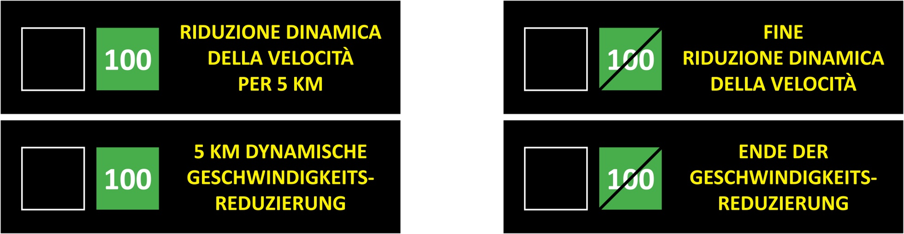 The begin and end of the sections for dynamic speed reduction for environmental purposes are always located in correspondence to gantry VMS, which are installed above the carriageway and allows the display of pictograms and message text. The measure is in operation when the message ' Riduzione dinamica velocità per xx km" appears, accompanied by a green pictogram indicating the maximum speed to be respected. The display of this speed indication is repeated periodically along the route on the panel-powered VMS, where only the pictograms are visualized.